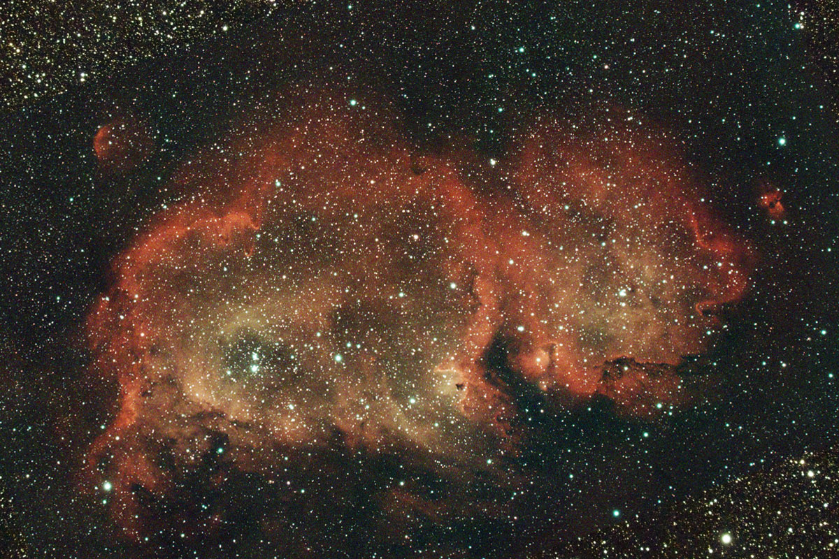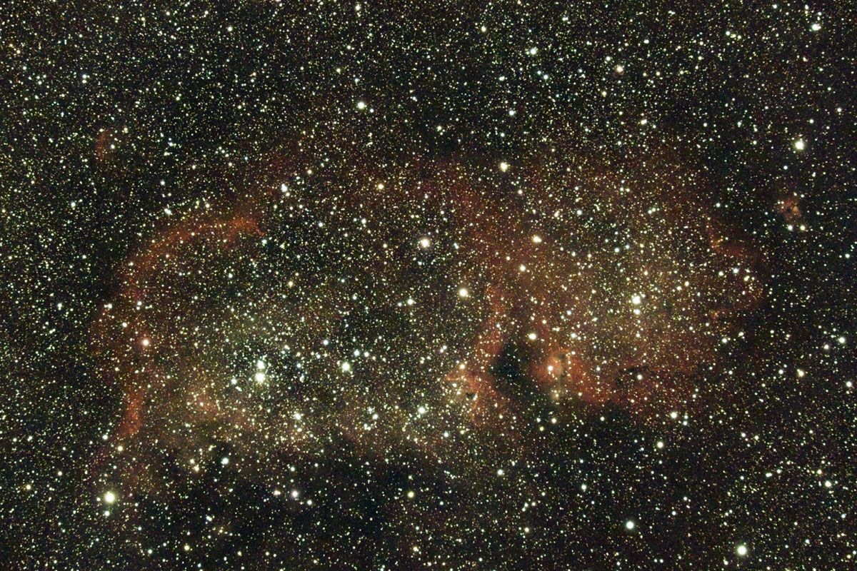 The next image, this time of the Soul nebula (IC 1848), demonstrates another benefit of the l-enhance filter, besides screening out light pollution. This part of the sky is very densely packed with stars, and while beautiful in their own right, they do obscure the nebula somewhat, detracting from its overall prominence in the image.