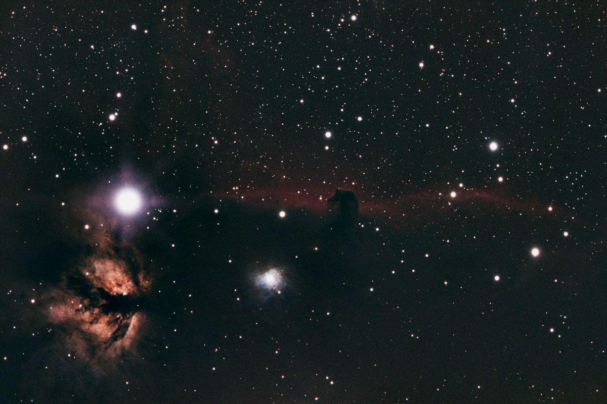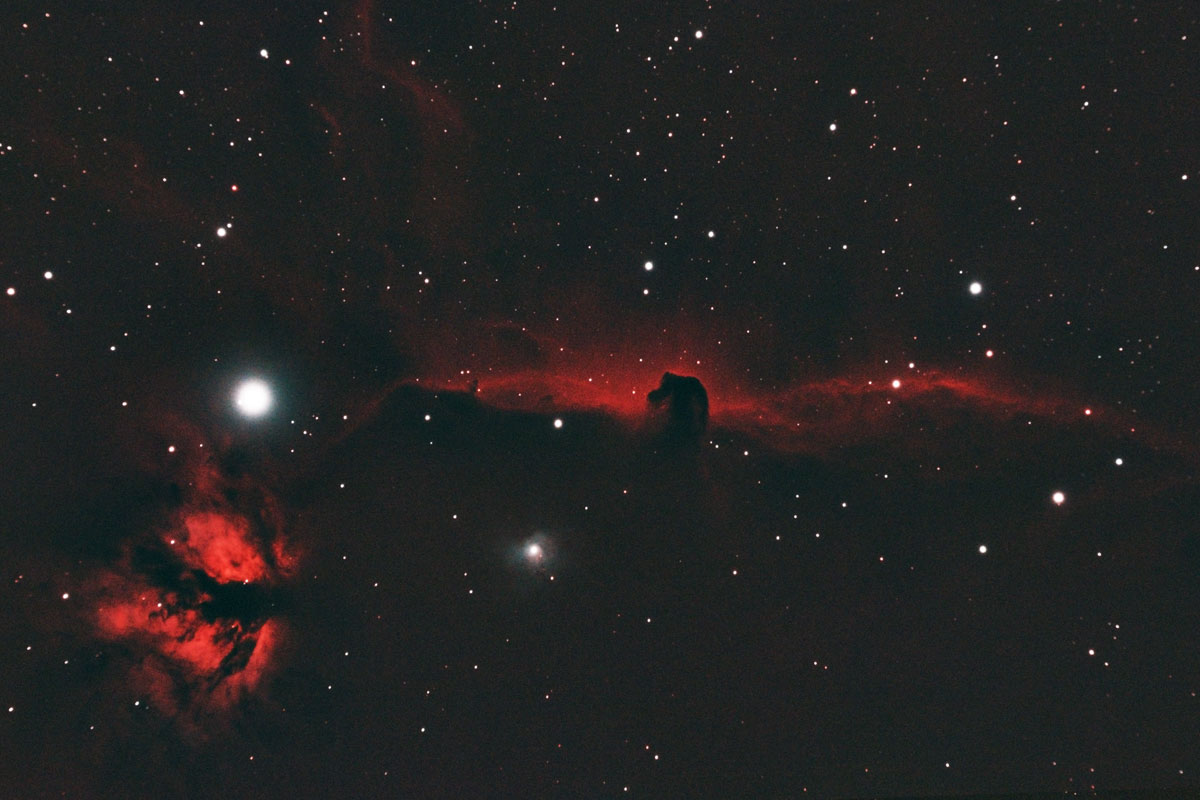 Below is a comparison of images of the horsehead and flame nebulae (IC 434 and NGC 2024), to demonstrate the effect of the l-enhance filter. The right-hand image (70 one-minute subs) was taken without a filter, and the left-hand image (40 one-minute subs) using the l-enhance filter. Despite only having just over half the total exposure time of the unfiltered equivalent, much more detail is visible in the image taken using the filter. The red colour cast this filter sometimes adds is also quite noticeable here.