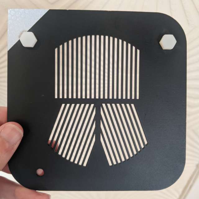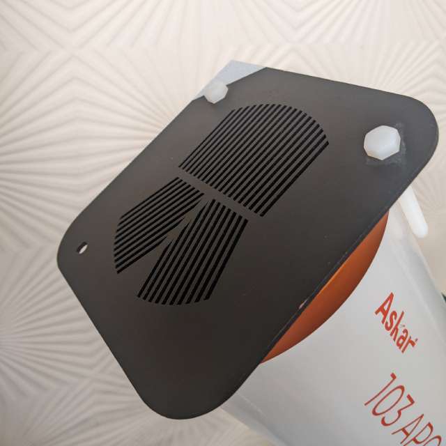 It's often surprisingly difficult to tell when an image is perfectly in focus, particularly with other factors like seeing affecting the apparent clarity and stability of the image. One beautifully simple but effective tool to resolve this is the Bahtinov mask. This is simply a sheet or board of opaque material large enough to cover the objective lens of the telescope, with a series of evenly-spaced slits cut into it in a specific pattern, as seen below.