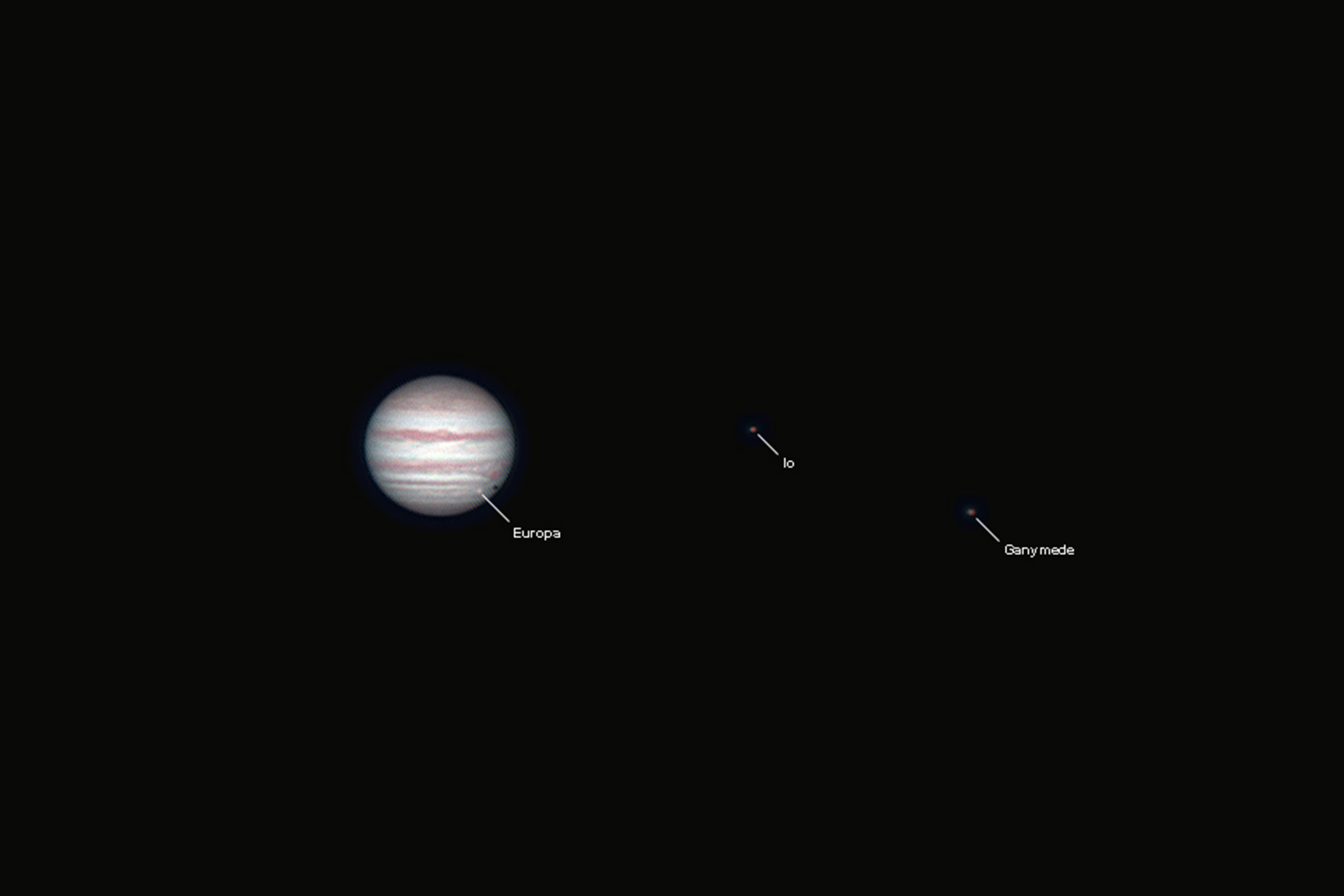 Three of the four Galilean moons can be seen clearly in the image. Europa, a bright, icy moon thought to have a liquid ocean below the surface which could even harbour life, can just be seen over the bottom right part of the planet. Europa's shadow, more prominent than the moon itself, is clearly visible just to the right.