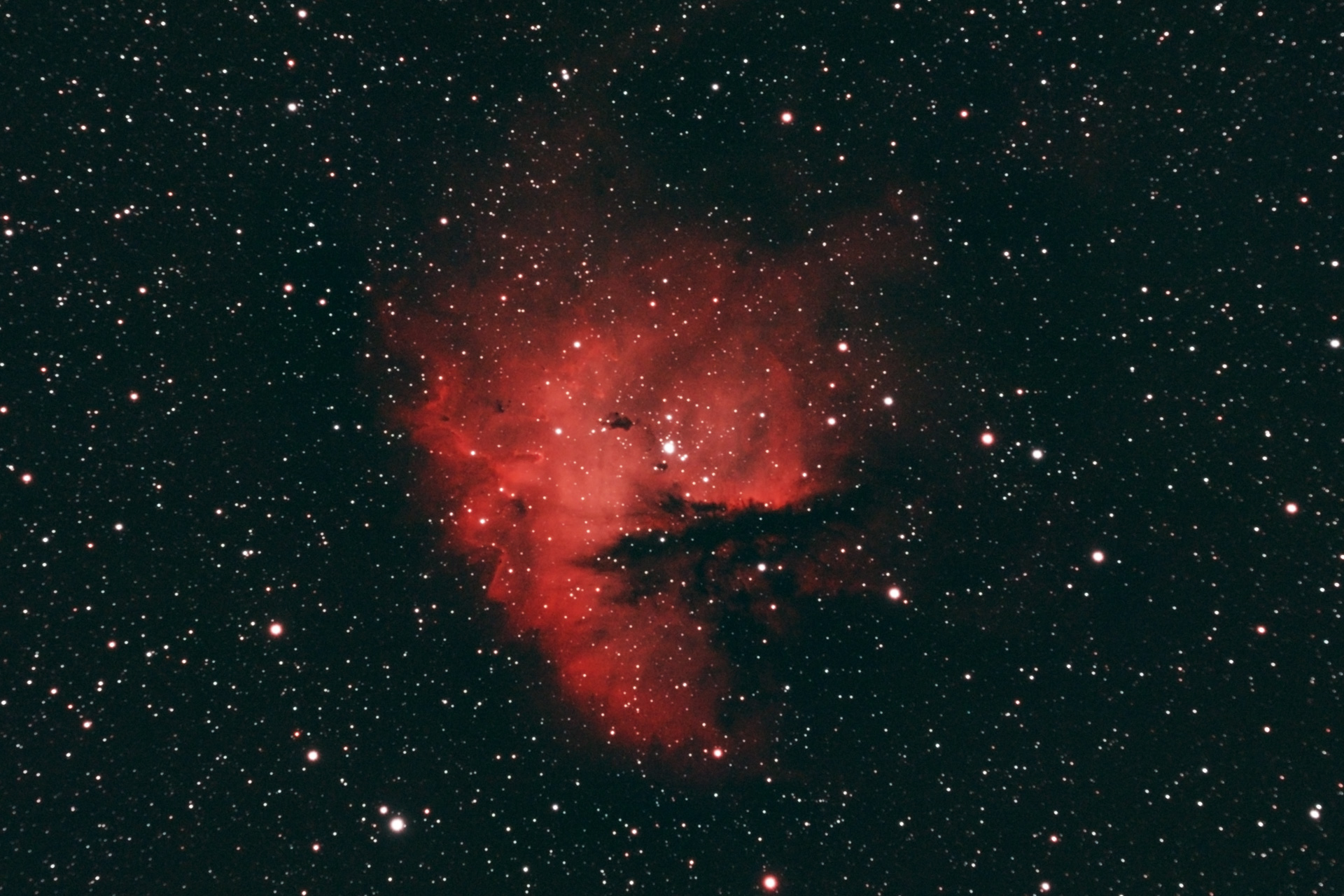 This image was captured with my usual deep-sky setup, with the addition of a dual-band filter, which blocks much of the light pollution that normally degrades nebula images in particular. Perhaps more importantly in this image, it also helps the nebula stand out against the sea of intervening stars which fill this part of the sky. It does give the image a noticeably red tint compared to the natural colours, but the tradeoff seems worth it as much more detail can be seen.
