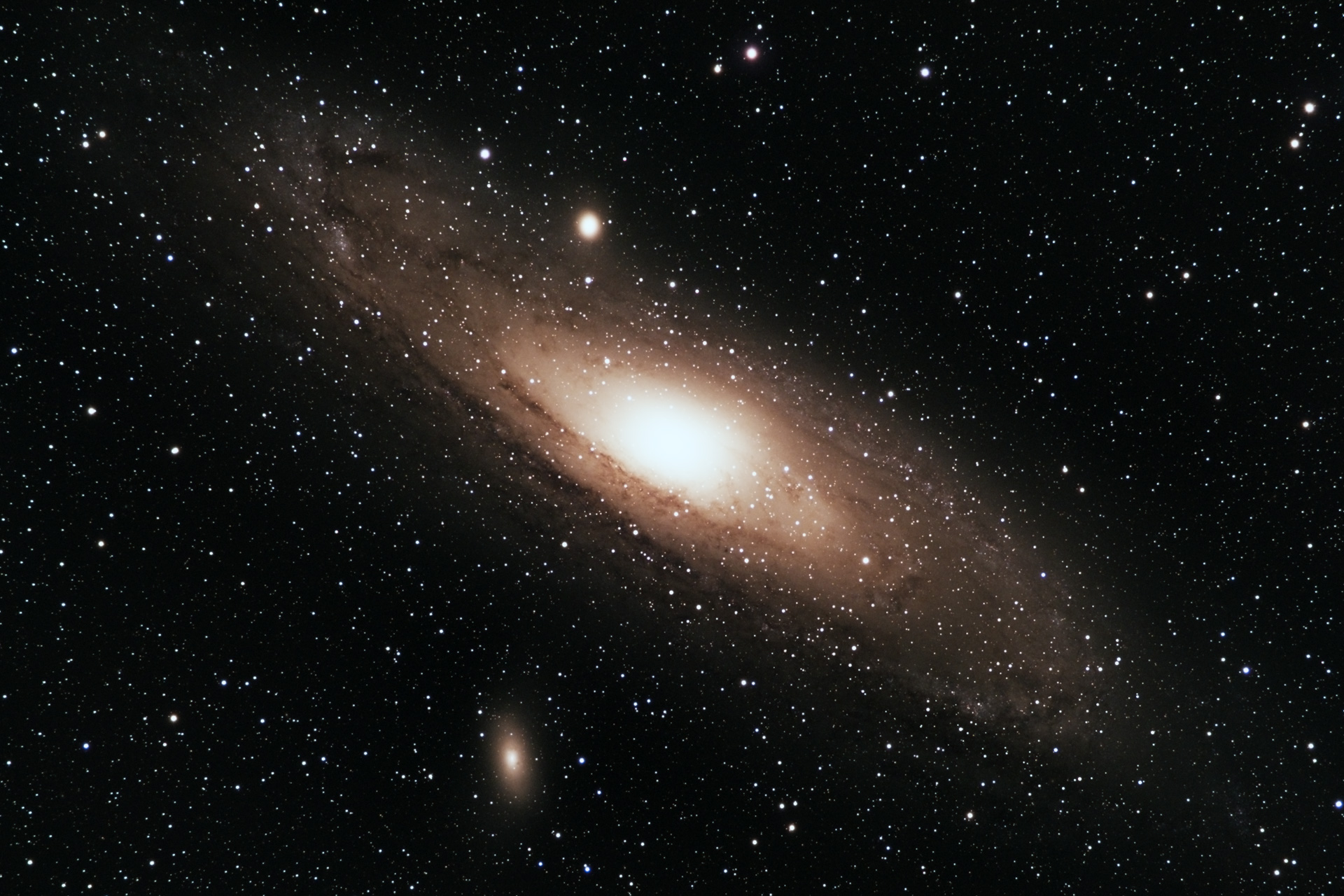 There is still room for improvement, aside from simply capturing more data - the bright core of the galaxy is over-exposed. This could be greatly improved by creating a HDR image using the same technique as my earlier picture of the Orion nebula, which is my aim when I next photograph this target. There is also some slight field curvature in the corners, but this is very expensive and difficult to fully correct, and the impact on the overall image is minor.