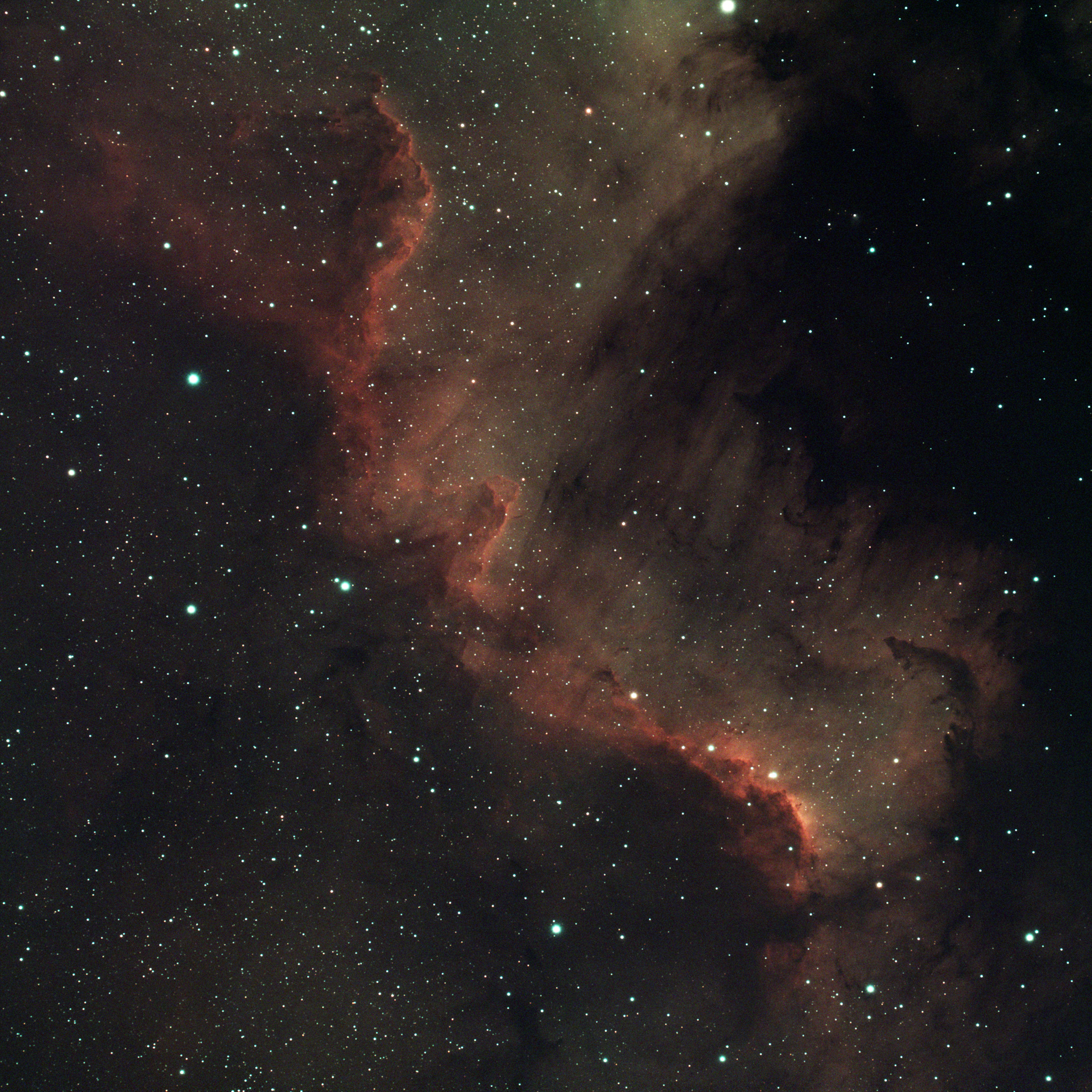 The large and magnificent North America nebula, named for its resemblance to the continent, is another gift from the constellation Cygnus. Part of the larger Cygnus Wall, it is an active star-forming region, and like most similar nebulae, is relatively young in astronomical terms. This image is only of part of the nebula, which is much too large to fit into my telescope's field of view.
